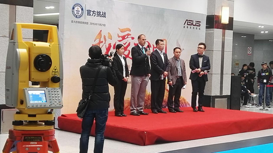 济南分公司技术人员上台宣布挑战吉尼斯世界纪录终测量面积 吉尼斯世界纪录认证官John Garland,在现场对jxf吉祥坊全站仪拍照留念.jpg)