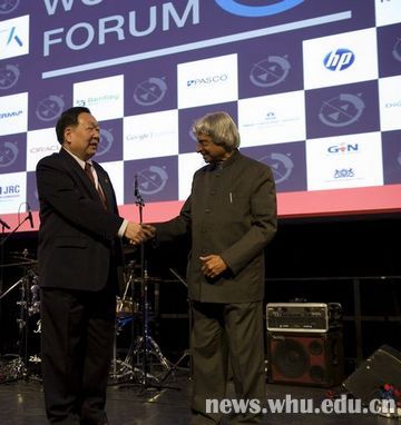 4月23日到4月25日,李德仁院士、朱宜萱教授赴荷兰阿姆斯特丹参加地理空间信息世界论坛,代表武汉大学领取“地理空间信息科学全球”奖,印度第11届总统阿卜杜尔·卡拉姆博士为其颁奖。李德仁于领奖的翌日下午,在“培训与教育:行业和研究机构的合作”专题中,作了题为《论地理空间信息的知识转化》的报告。